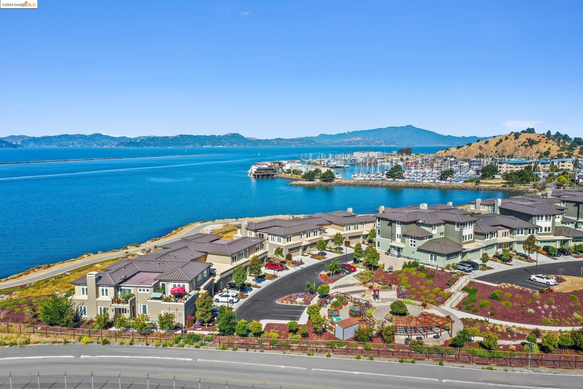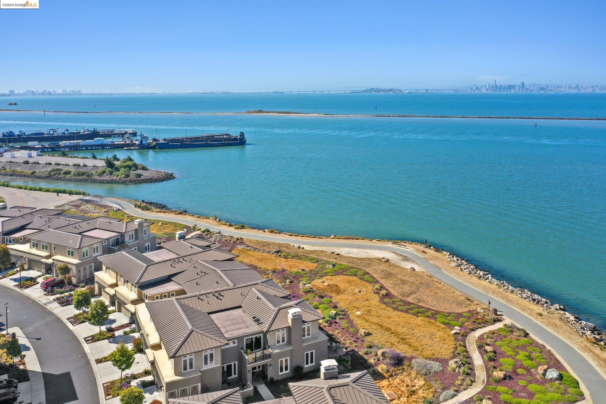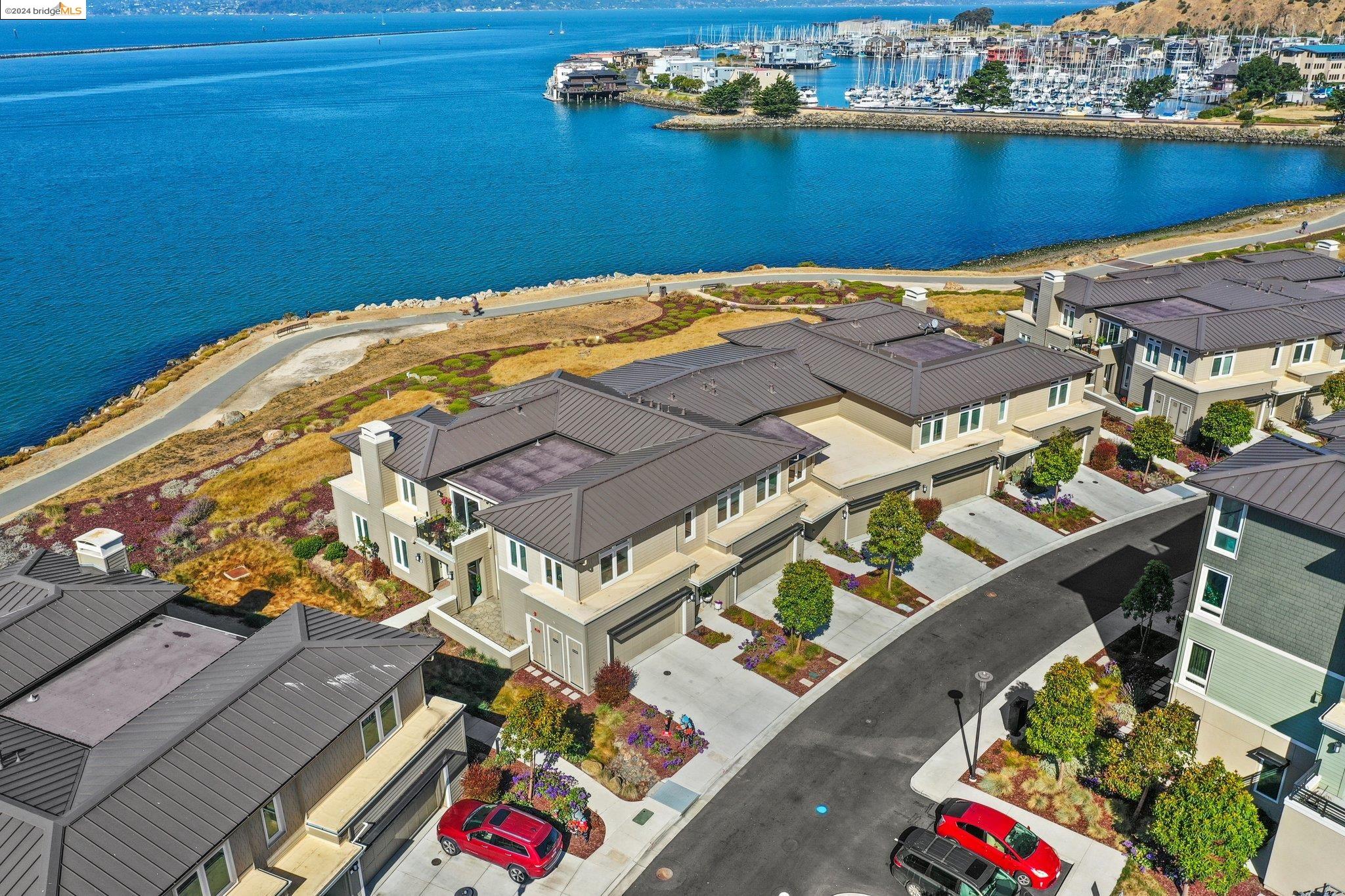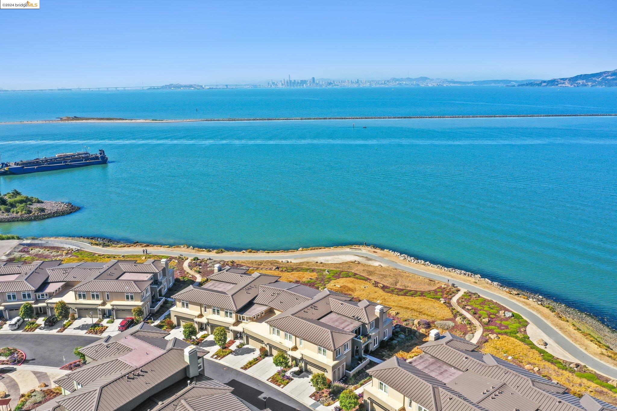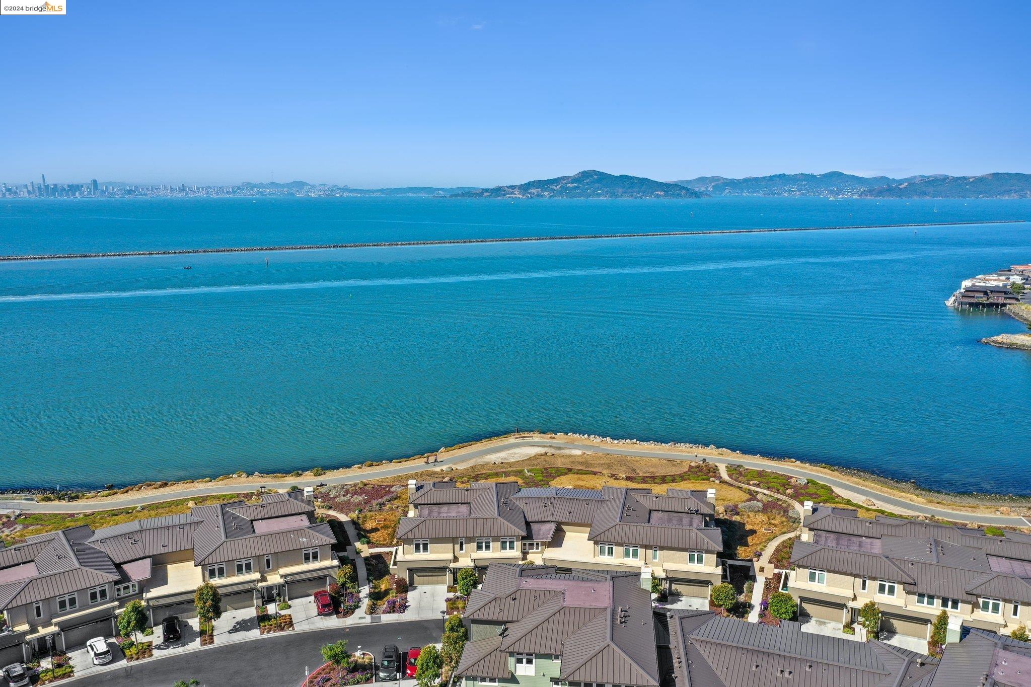 Experience unparalleled luxury and stunning vistas in this exquisite 3-bedroom, 3.5-bathroom home, boasting unobstructed panoramic views of San Francisco and the Bay. Imagine coming home to this secluded oasis with only beautifully landscaped grounds and a walking trail that separates you and the Bay. The open floor plan with living and dining areas, along with an expansive kitchen is perfect for modern living, and features a main level bedroom with an en-suite bath and two additional en-suite bedrooms on the second level, both with private balconies overlooking the Bay. The sun-drenched primary suite is a superb retreat featuring a sitting area, a spacious and sumptuous bath with a deep soaking tub and stall shower, and a walk-in closet. Enjoy the serenity of the lovely back patio with breathtaking views of SF, perfect for enjoying your morning coffee or sipping on your favorite cocktail. This unit is unique, with no residences above or below, ensuring ultimate privacy and tranquility. Conveniently located with easy ferry access to San Francisco and just minutes to Marin, Berkeley, and other East Bay amenities, this home offers both convenience and elegance. Don't miss the opportunity to own one of the most coveted properties with unrivaled views and exceptional living spaces.
