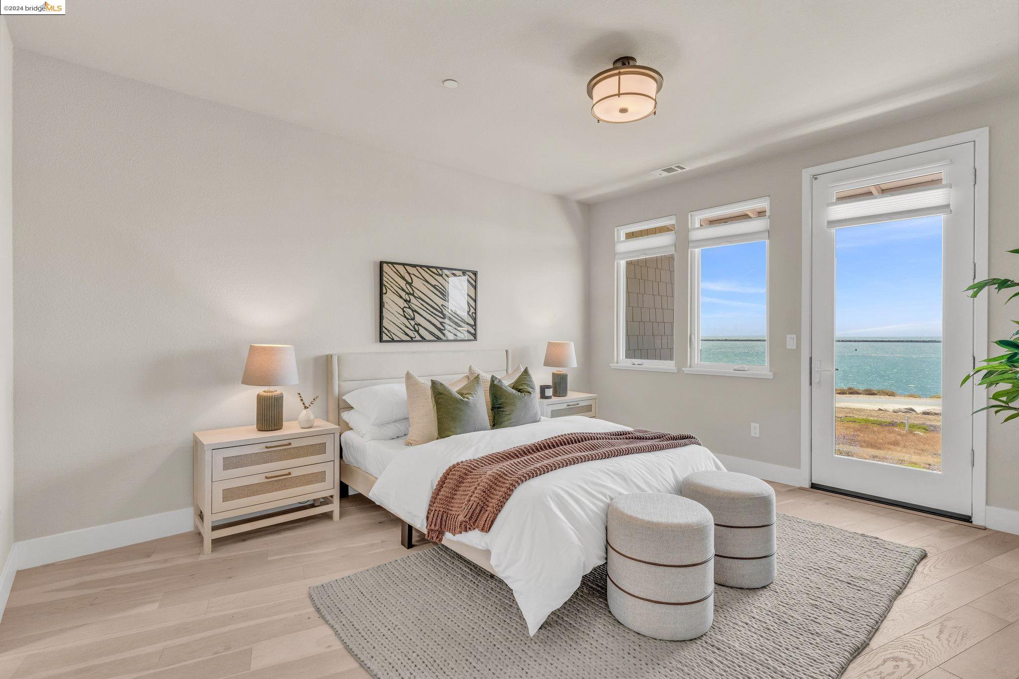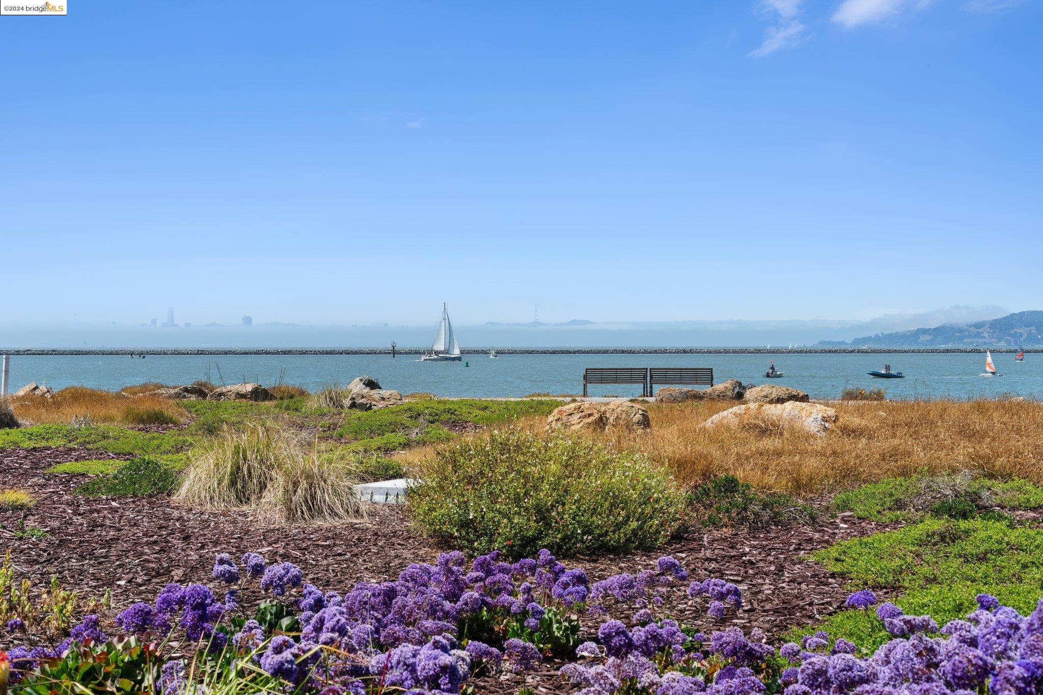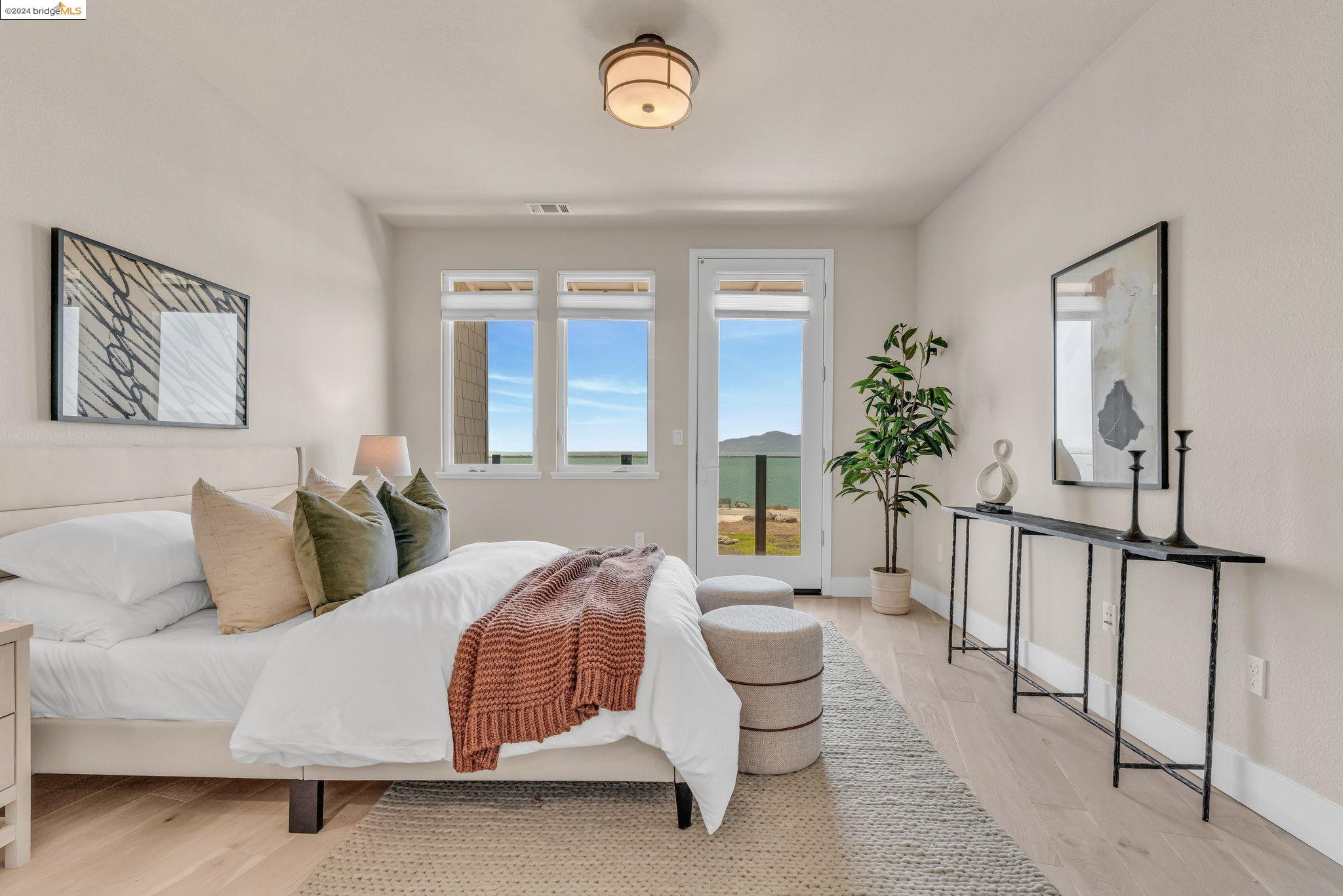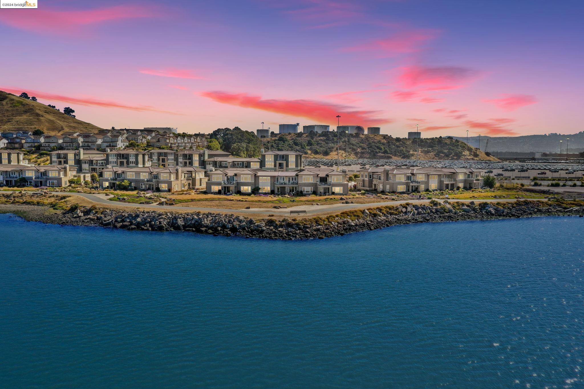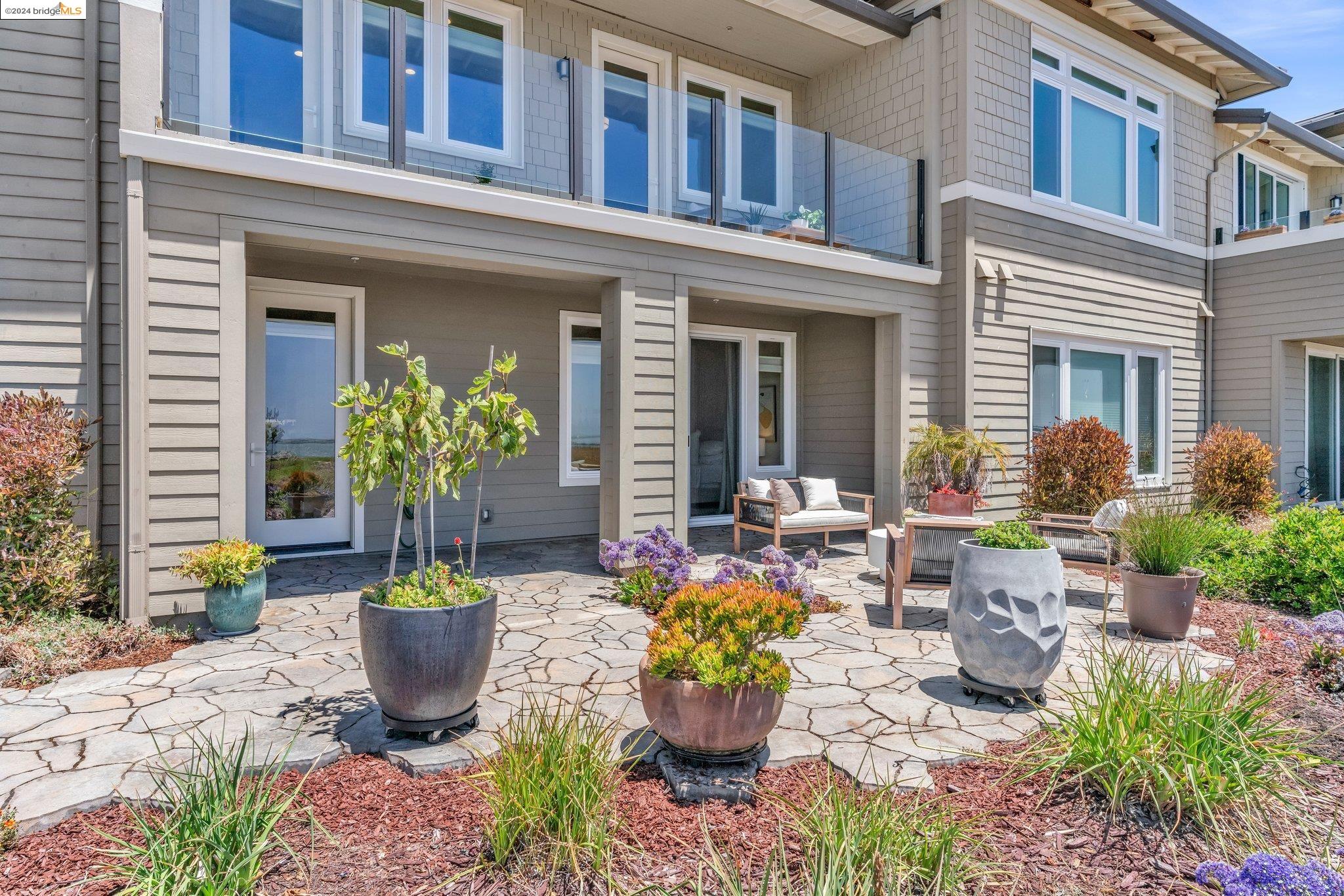 Experience unparalleled luxury and stunning vistas in this exquisite 3-bedroom, 3.5-bathroom home, boasting unobstructed panoramic views of San Francisco and the Bay. Imagine coming home to this secluded oasis with only beautifully landscaped grounds and a walking trail that separates you and the Bay. The open floor plan with living and dining areas, along with an expansive kitchen is perfect for modern living, and features a main level bedroom with an en-suite bath and two additional en-suite bedrooms on the second level, both with private balconies overlooking the Bay. The sun-drenched primary suite is a superb retreat featuring a sitting area, a spacious and sumptuous bath with a deep soaking tub and stall shower, and a walk-in closet. Enjoy the serenity of the lovely back patio with breathtaking views of SF, perfect for enjoying your morning coffee or sipping on your favorite cocktail. This unit is unique, with no residences above or below, ensuring ultimate privacy and tranquility. Conveniently located with easy ferry access to San Francisco and just minutes to Marin, Berkeley, and other East Bay amenities, this home offers both convenience and elegance. Don't miss the opportunity to own one of the most coveted properties with unrivaled views and exceptional living spaces.
