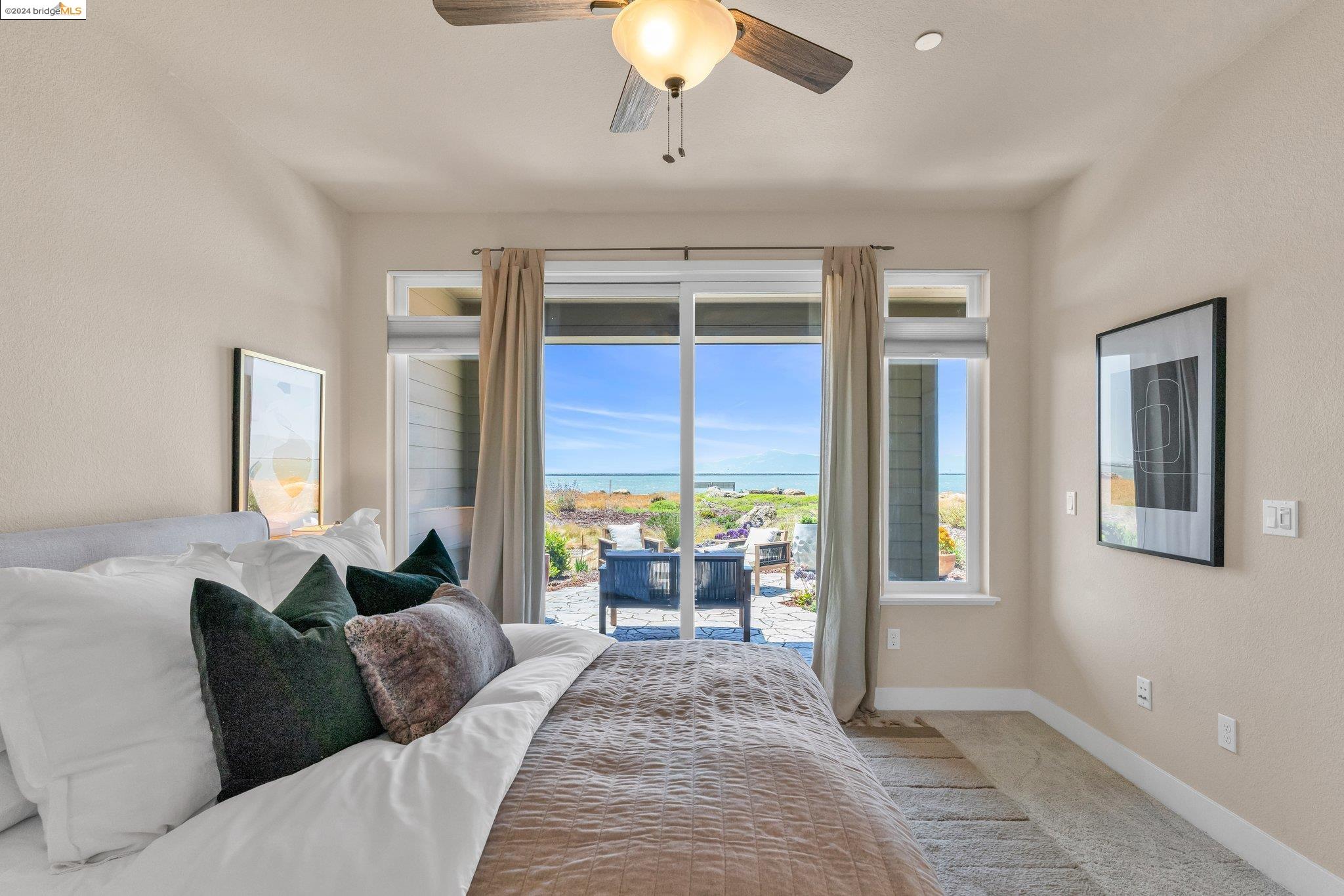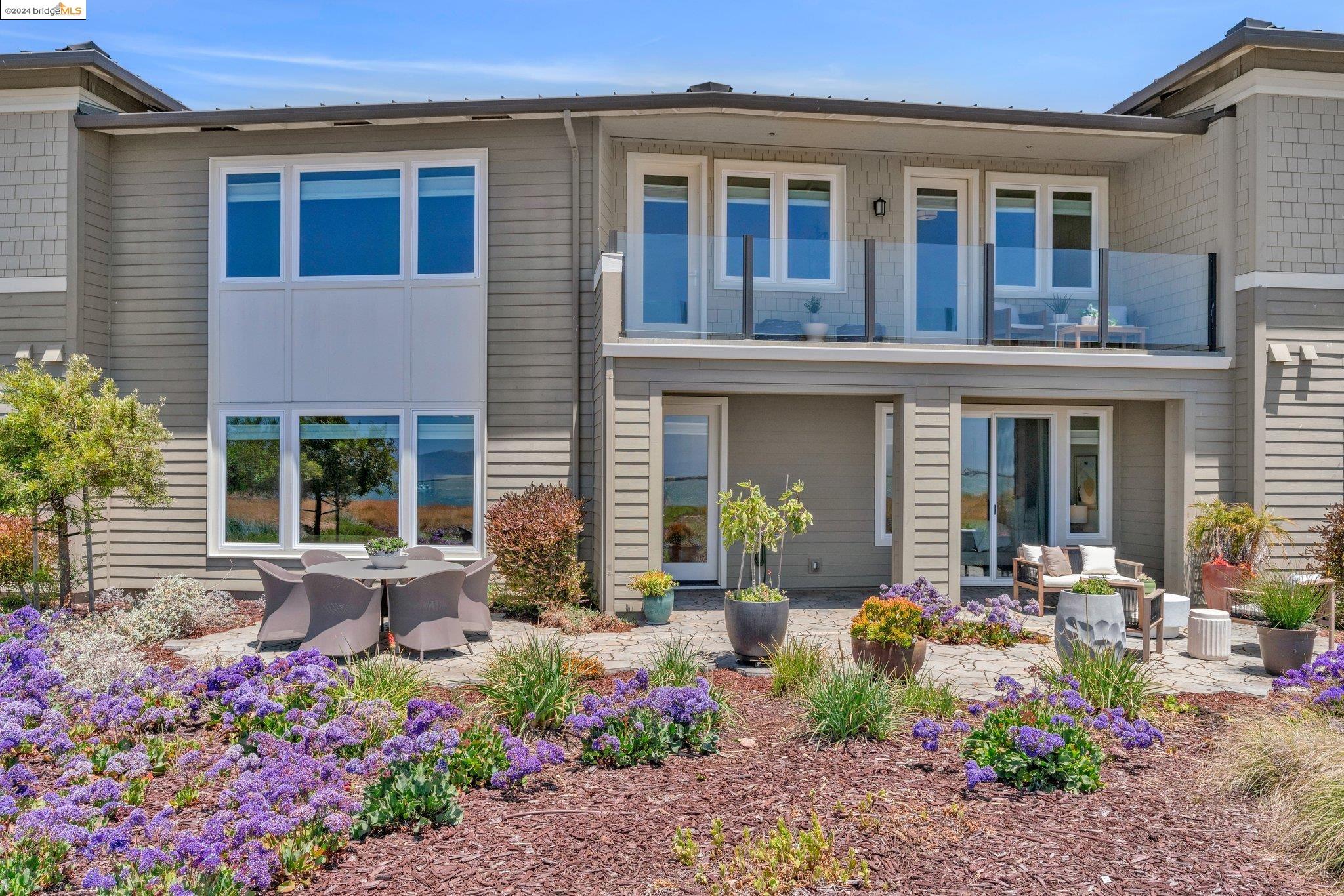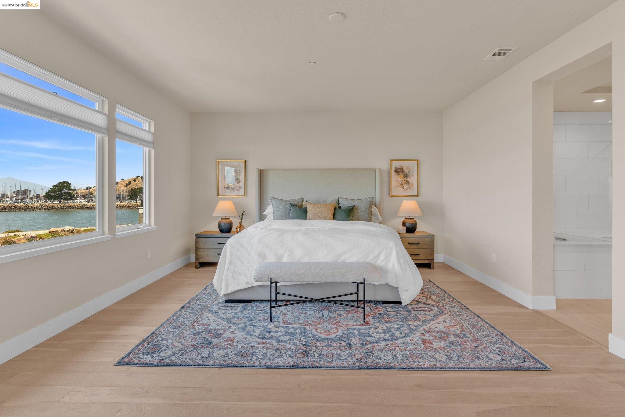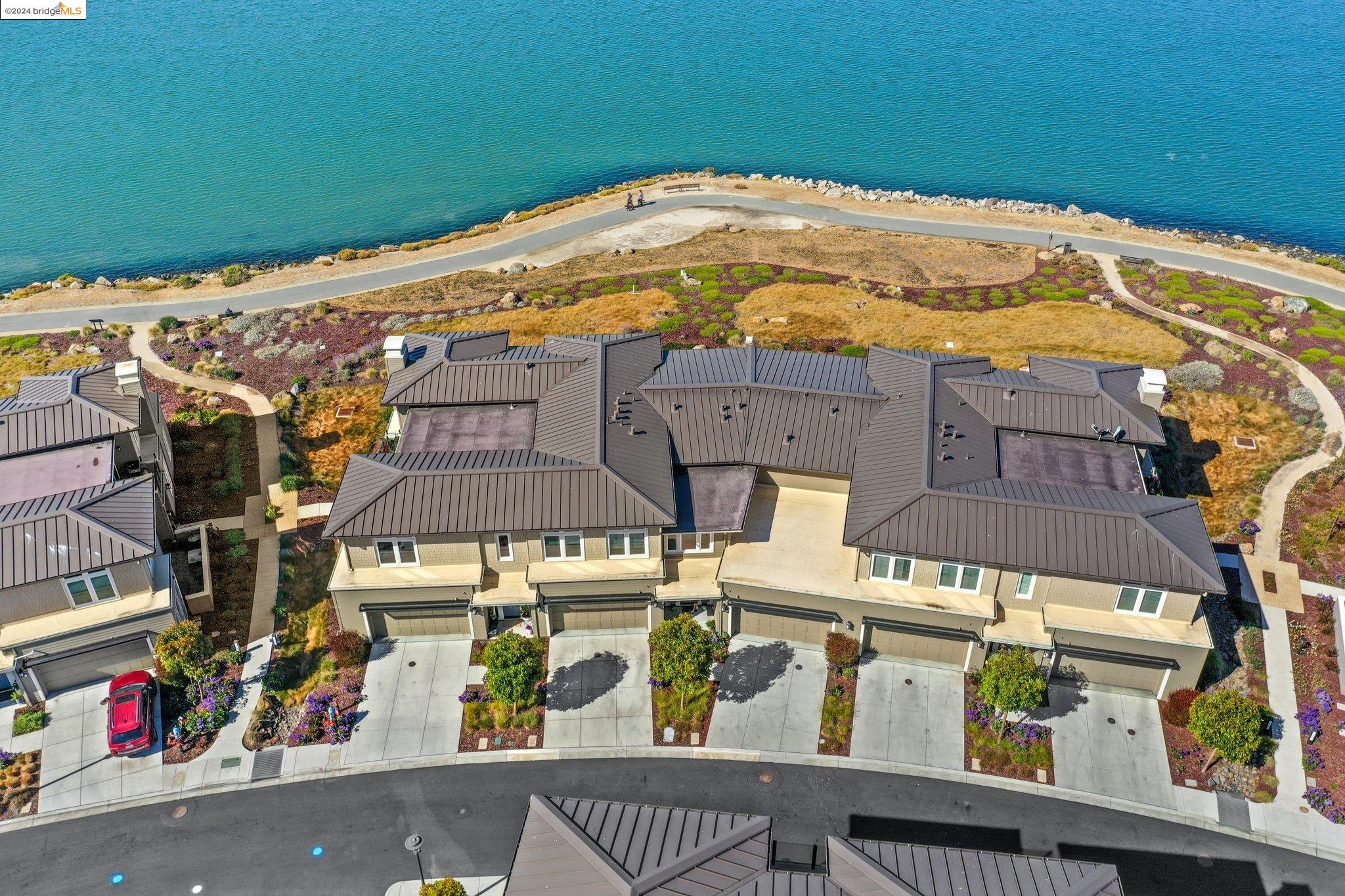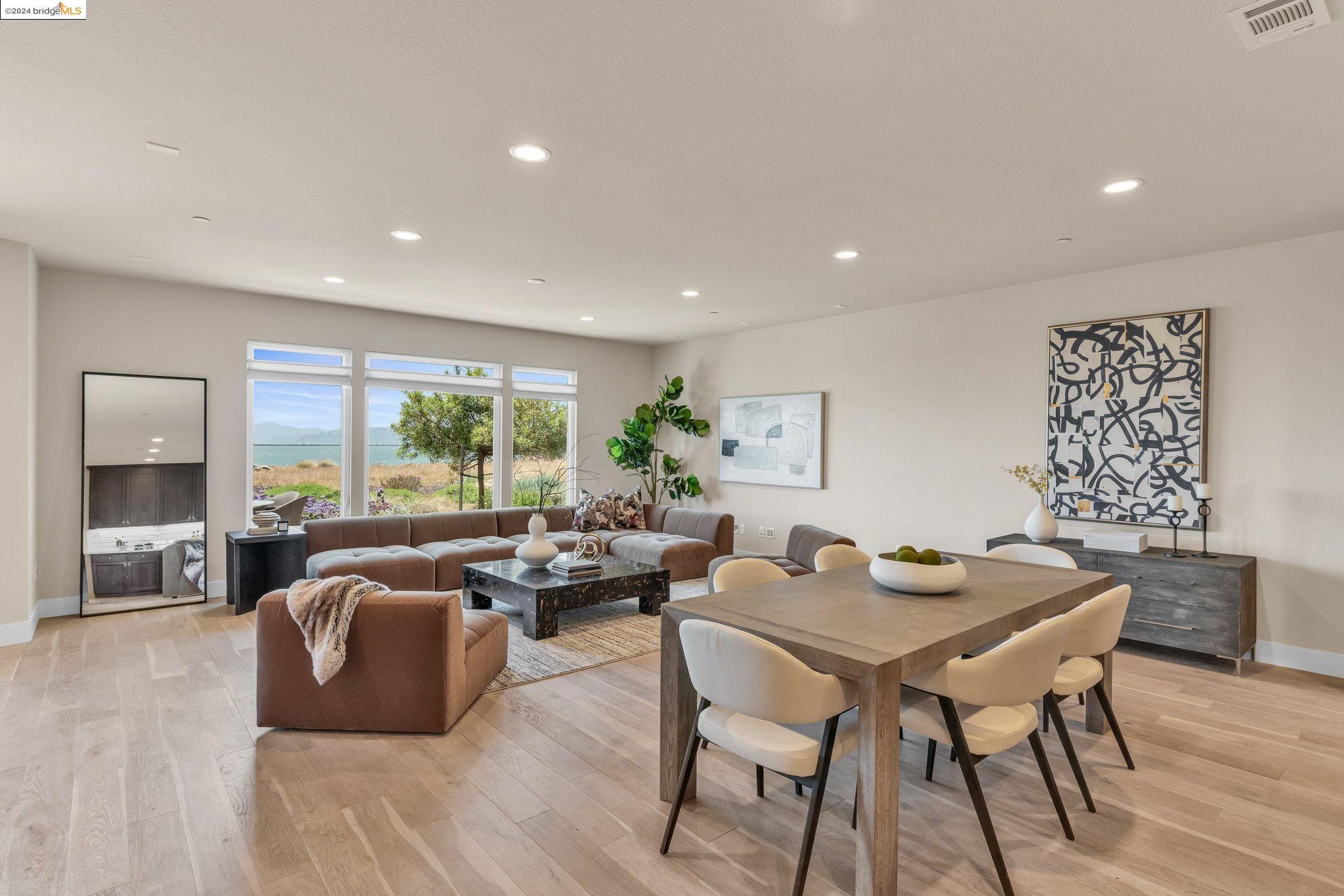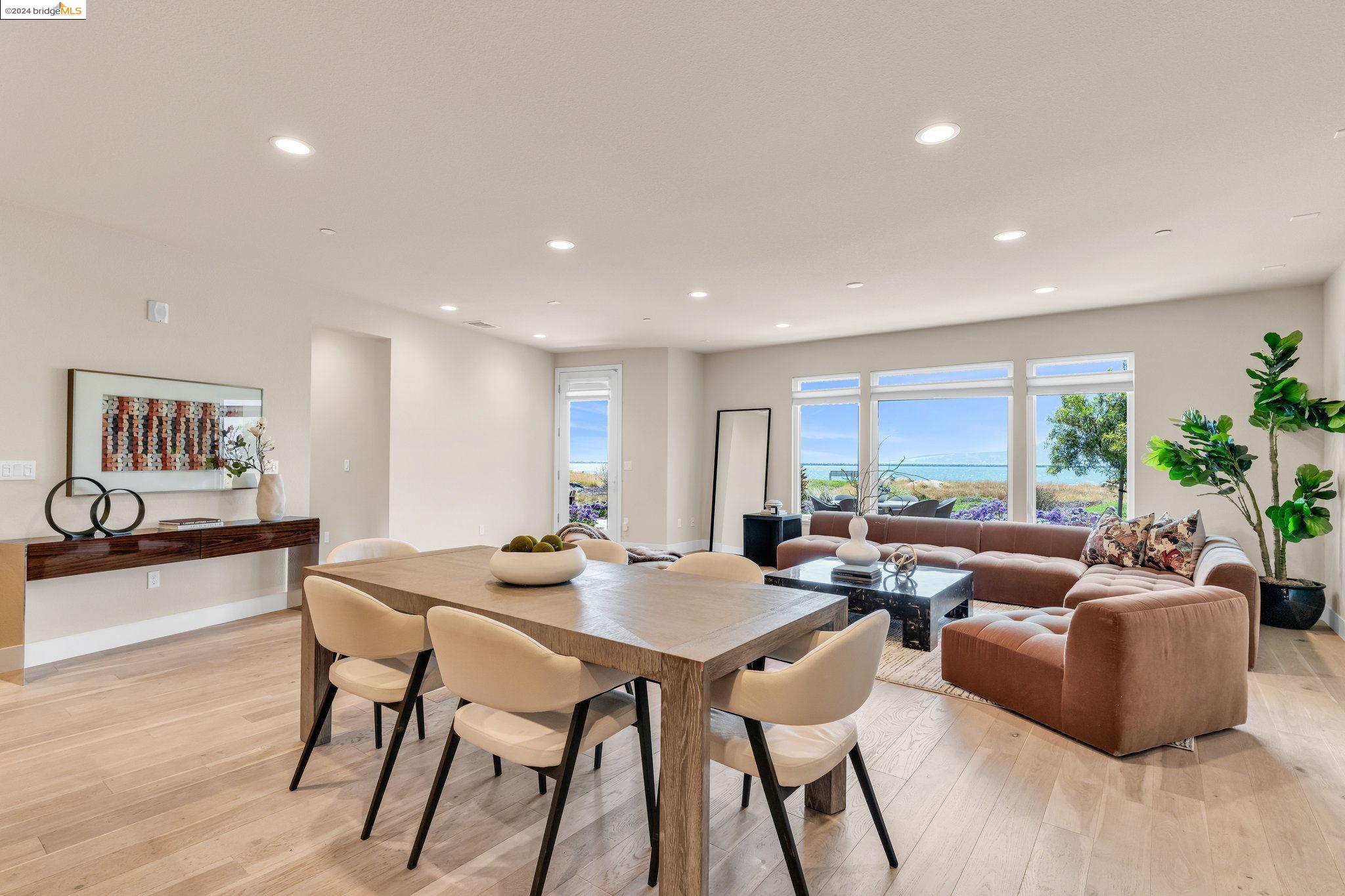 Experience unparalleled luxury and stunning vistas in this exquisite 3-bedroom, 3.5-bathroom home, boasting unobstructed panoramic views of San Francisco and the Bay. Imagine coming home to this secluded oasis with only beautifully landscaped grounds and a walking trail that separates you and the Bay. The open floor plan with living and dining areas, along with an expansive kitchen is perfect for modern living, and features a main level bedroom with an en-suite bath and two additional en-suite bedrooms on the second level, both with private balconies overlooking the Bay. The sun-drenched primary suite is a superb retreat featuring a sitting area, a spacious and sumptuous bath with a deep soaking tub and stall shower, and a walk-in closet. Enjoy the serenity of the lovely back patio with breathtaking views of SF, perfect for enjoying your morning coffee or sipping on your favorite cocktail. This unit is unique, with no residences above or below, ensuring ultimate privacy and tranquility. Conveniently located with easy ferry access to San Francisco and just minutes to Marin, Berkeley, and other East Bay amenities, this home offers both convenience and elegance. Don't miss the opportunity to own one of the most coveted properties with unrivaled views and exceptional living spaces.