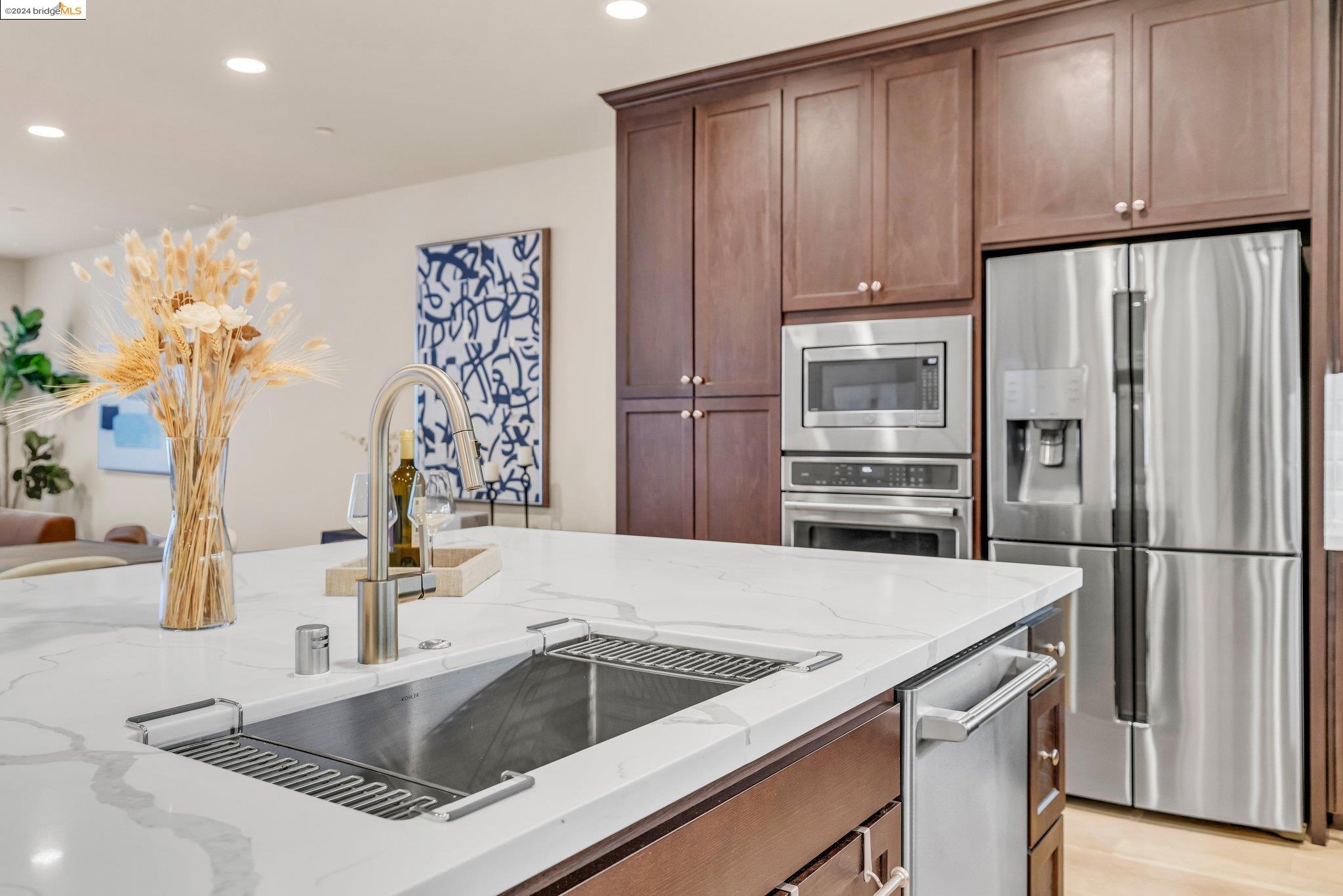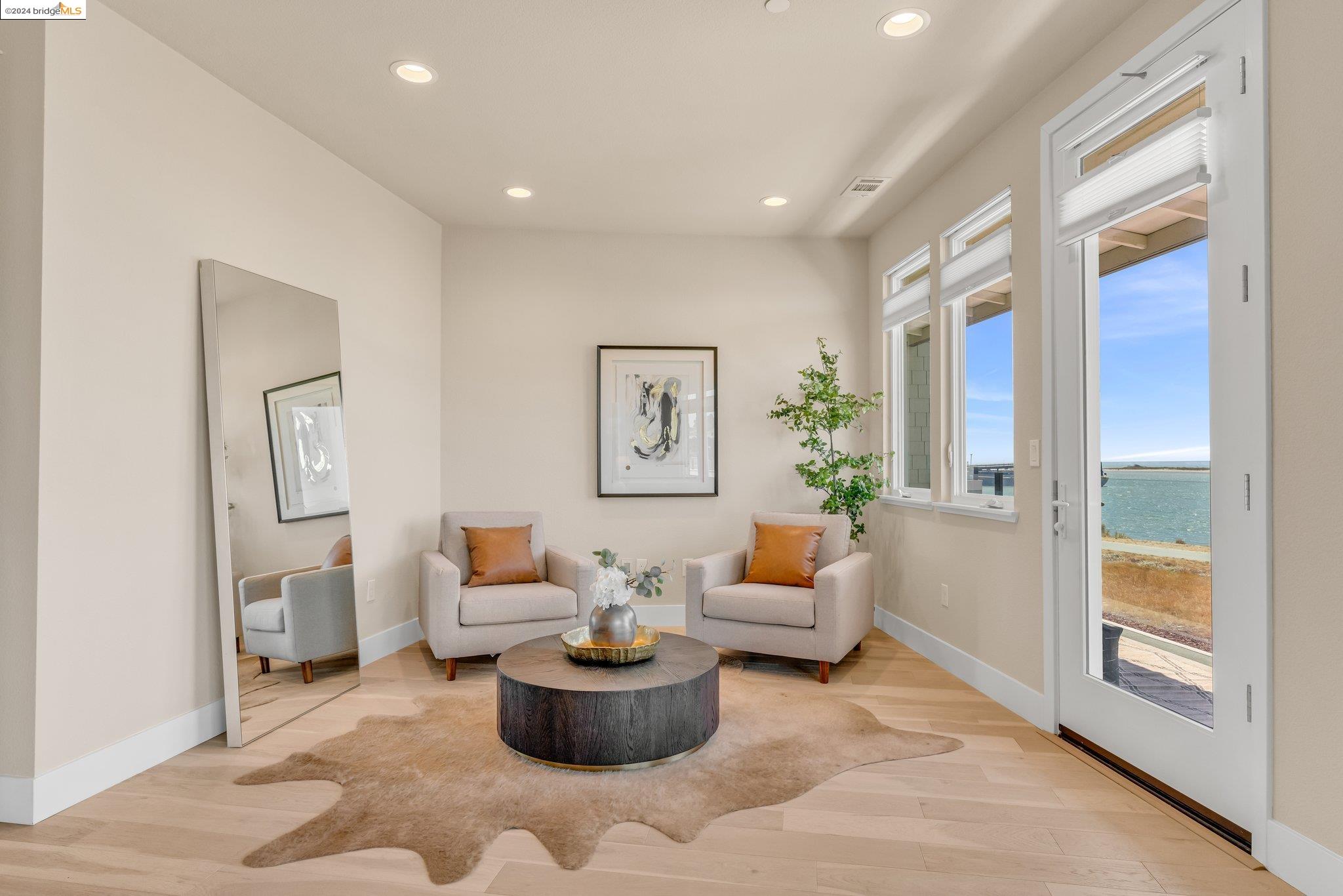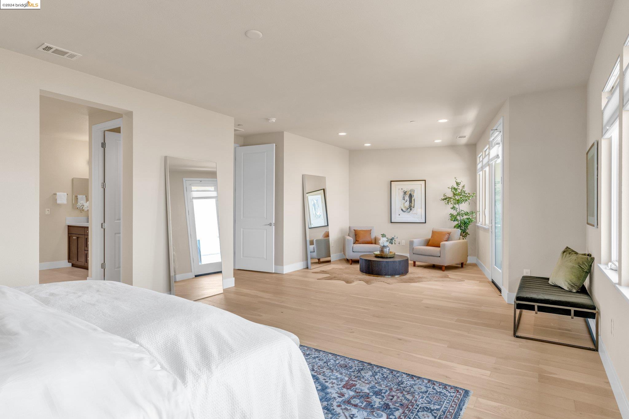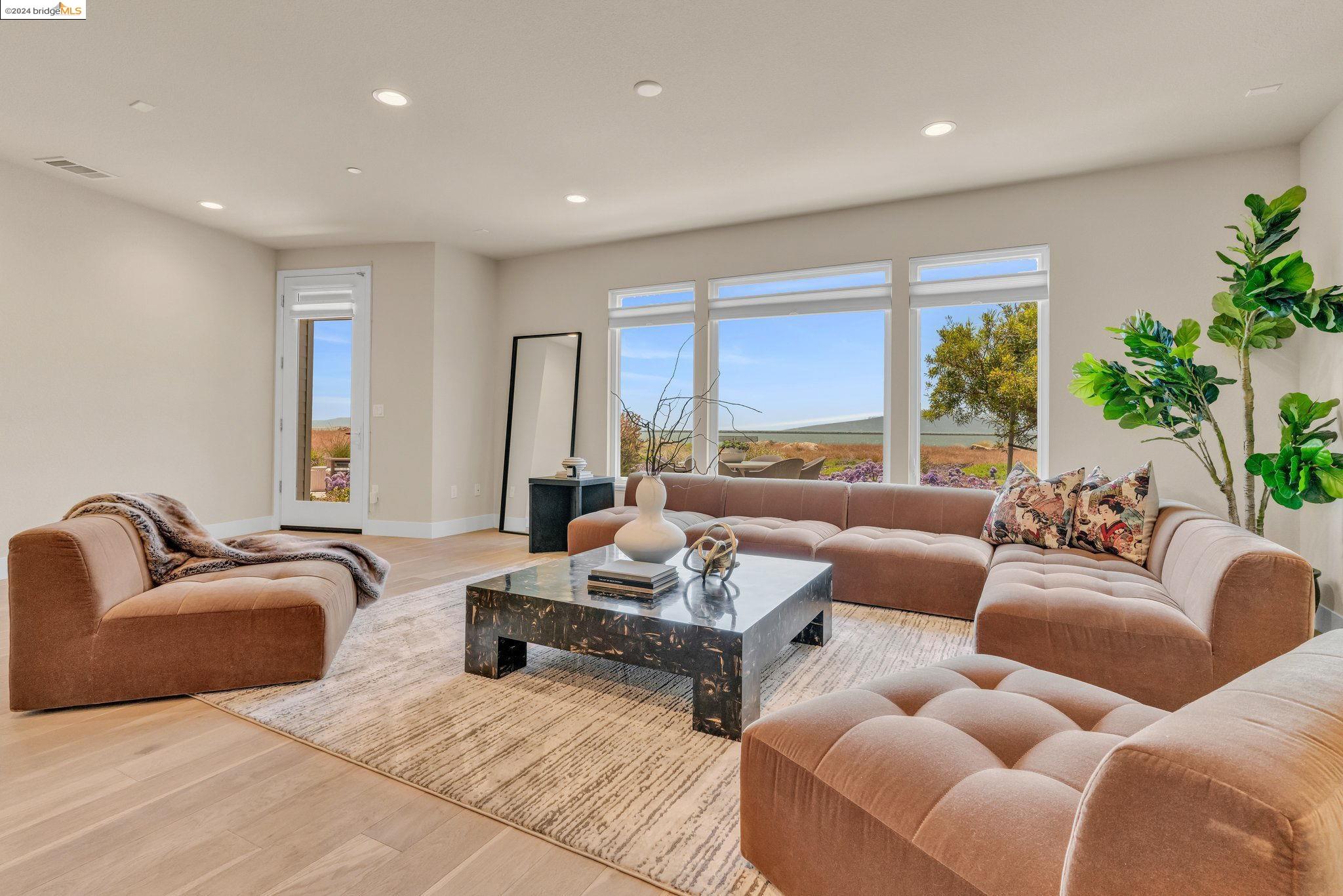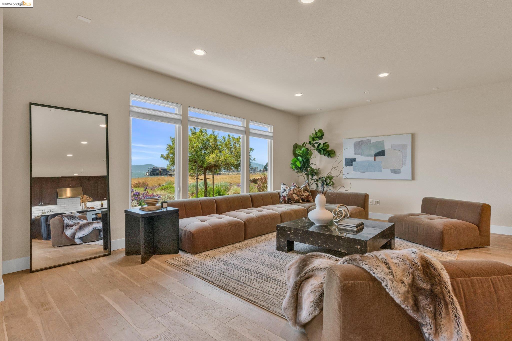 Experience unparalleled luxury and stunning vistas in this exquisite 3-bedroom, 3.5-bathroom home, boasting unobstructed panoramic views of San Francisco and the Bay. Imagine coming home to this secluded oasis with only beautifully landscaped grounds and a walking trail that separates you and the Bay. The open floor plan with living and dining areas, along with an expansive kitchen is perfect for modern living, and features a main level bedroom with an en-suite bath and two additional en-suite bedrooms on the second level, both with private balconies overlooking the Bay. The sun-drenched primary suite is a superb retreat featuring a sitting area, a spacious and sumptuous bath with a deep soaking tub and stall shower, and a walk-in closet. Enjoy the serenity of the lovely back patio with breathtaking views of SF, perfect for enjoying your morning coffee or sipping on your favorite cocktail. This unit is unique, with no residences above or below, ensuring ultimate privacy and tranquility. Conveniently located with easy ferry access to San Francisco and just minutes to Marin, Berkeley, and other East Bay amenities, this home offers both convenience and elegance. Don't miss the opportunity to own one of the most coveted properties with unrivaled views and exceptional living spaces.